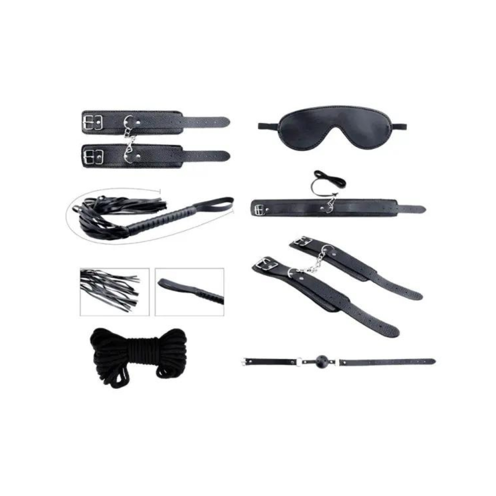 Incluyo un antifaz, una mordaza, 5 metros de cuerda, esposas para las manos, esposas para los tobillos, un látigo, una correa y un collar. Si te gusta el mundo de la dominación y la sumisión, este kit tiene todo lo que necesitas para una sesión con diversión y placer garantizados.