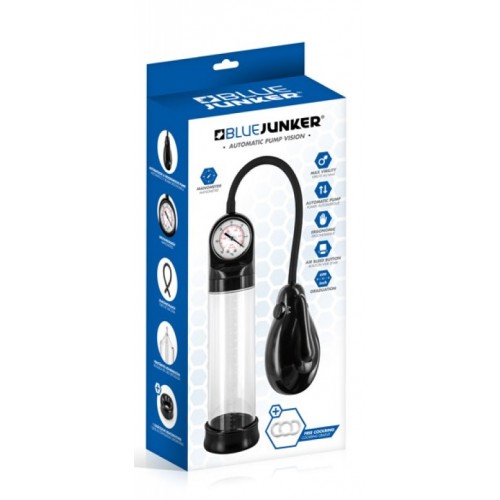 Soy una bomba de vacío con un cómodo y sencillo sistema que te permite vaciar automáticamente el aire presionando solo el botón ON/OFF. Incluyo un manómetro para que me controles a tu gusto. Además, vengo con un anillo para ejercer una mayor presión sobre el pene y los testículos ayudando a que tengas una erección más dura y prolongada combinada con el efecto vasodilatador que producen mis succiones.