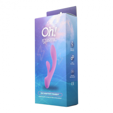 Soy el Mistery Rabbit de la marca Ohrgasmic, un vibrador de doble estimulación para convertirme en tu mejor compañero de juegos. Con mi forma curvada estimularé tu punto G con mis ricas y deliciosas vibraciones además de estimular a la vez tu clítoris con mi lengua superior para que explotes del placer.